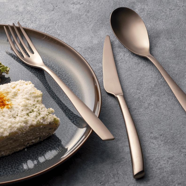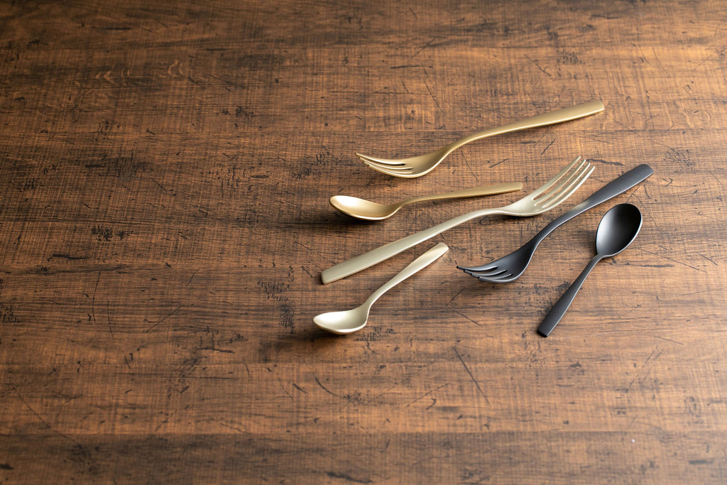 世界のトレンドを反映させた細身のリビエラは、チタンコーティングのPVD加工により、優れた耐久性と独創的なカラーバリエーションが特徴です。それぞれのアイテムの完成度が高く機能性に長けているため、パスタ用フォーク、カレー用のスプーンなど、まずはお好みの料理に合わせた1本をお選びいただくのもおすすめです。